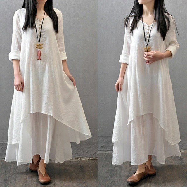 Retro 2019 Spring Boho Women V Nekc Peasant Ethnic Cotton Linen Maxi Dress Casual Long Sleeve Button Irregular Long Dress hot